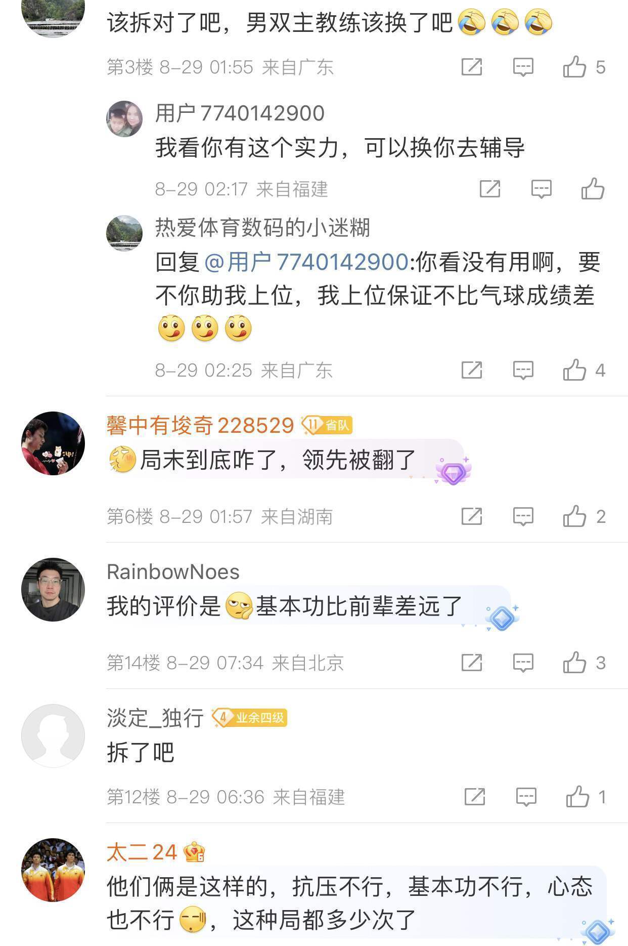还有不少网友批驳:“拆对吧!收成不会比这更差了!”“这对组合照旧失去了夙昔的霸气和积极性,基本功比前辈差远了。”“男双主磨真金不怕火该换了。”除男双除外,中国队在其他几个单项也濒临着不小争冠压力。石宇奇和翁泓阳将在男单1/4决赛同室操戈,只须一东说念主大略晋级四强。女单仅剩陈雨菲和韩悦,陈柏阳和刘毅成为男双独苗,刘圣书和谭宁、贾一凡和张殊贤也将演出内战。