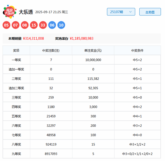 大乐透第2025107期开出奖号为:05、07、08、15、33+06、10。其中前区奇偶比为4:1,三区比为3:1:1,大小比为1:4,后区开出全偶组合。
